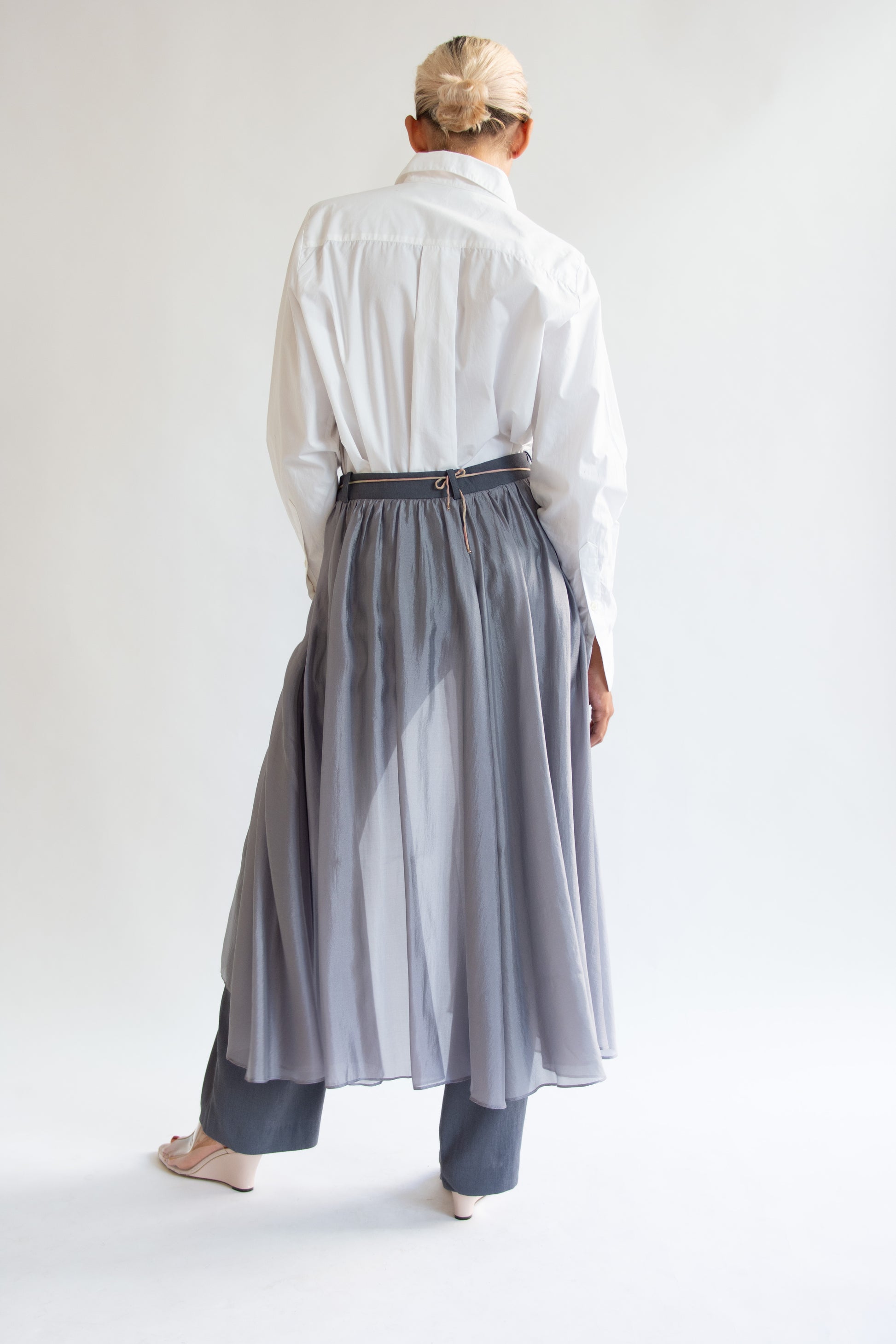 Wide-leg pants with overlay sheer skirt in Grey colors. Button front fly closure, with invisible zipper. Belt loops.