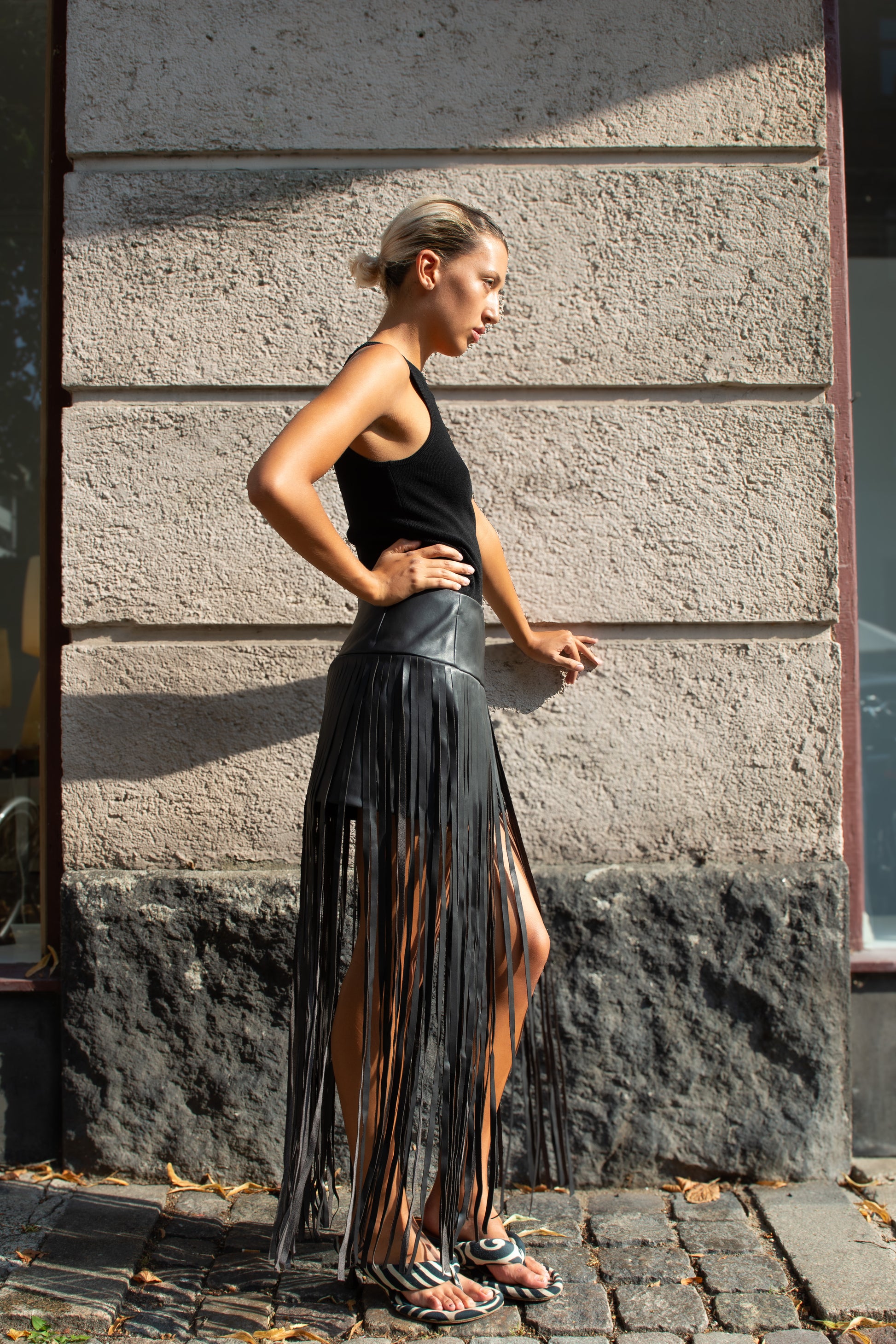High-waisted mini skirt in Black, with long leather-look fringes. Perfect to style as layering. Invisible zipper closure at side. Fully lined.