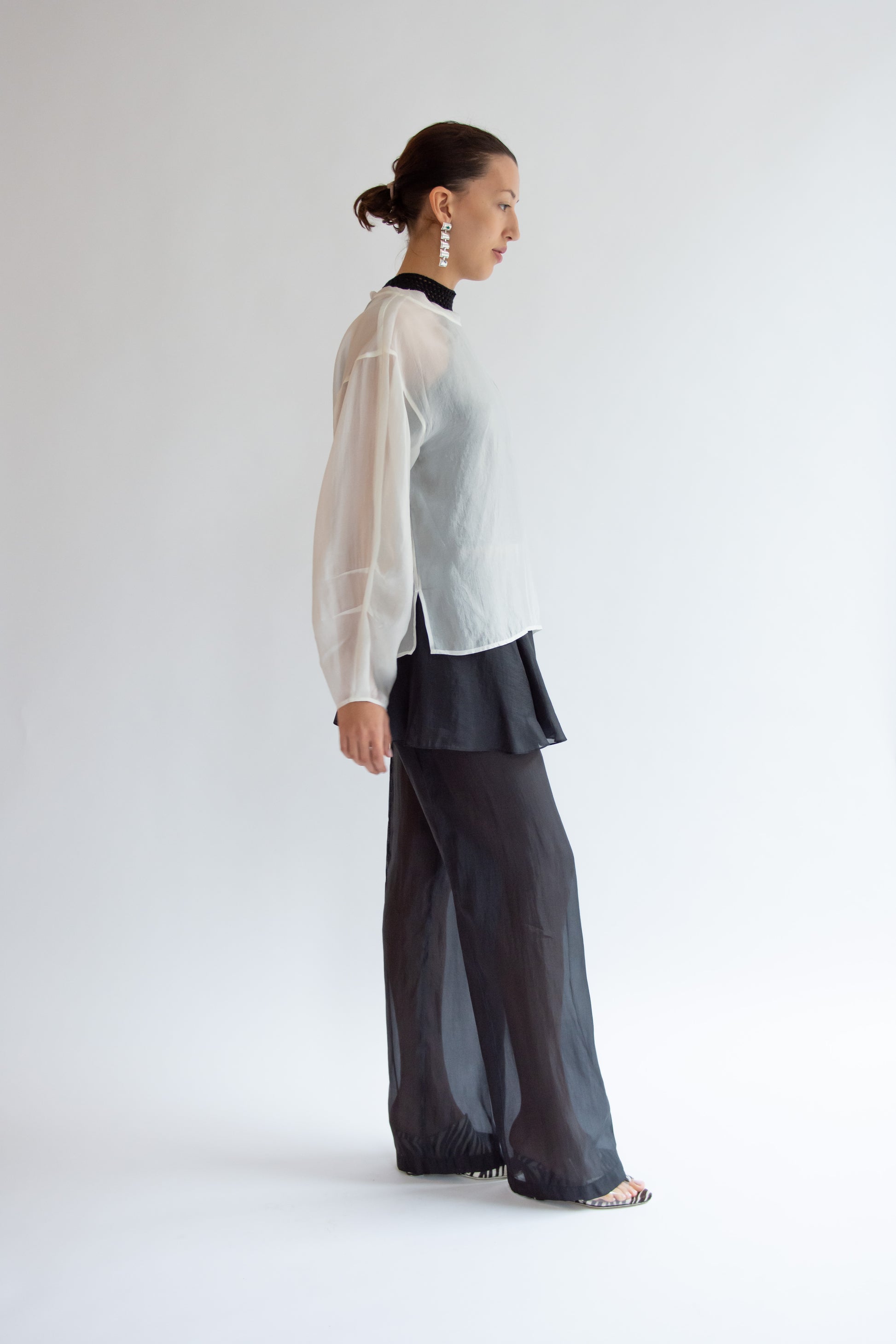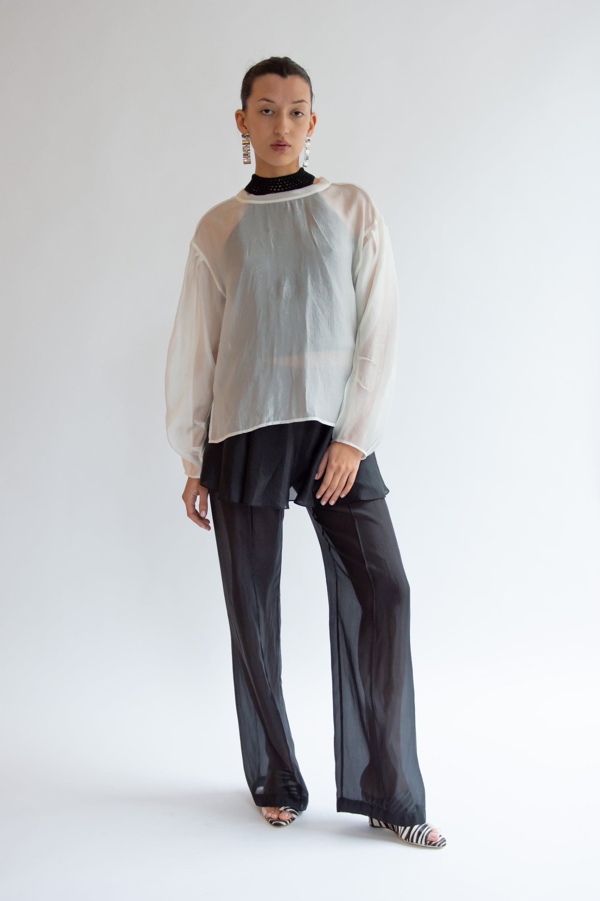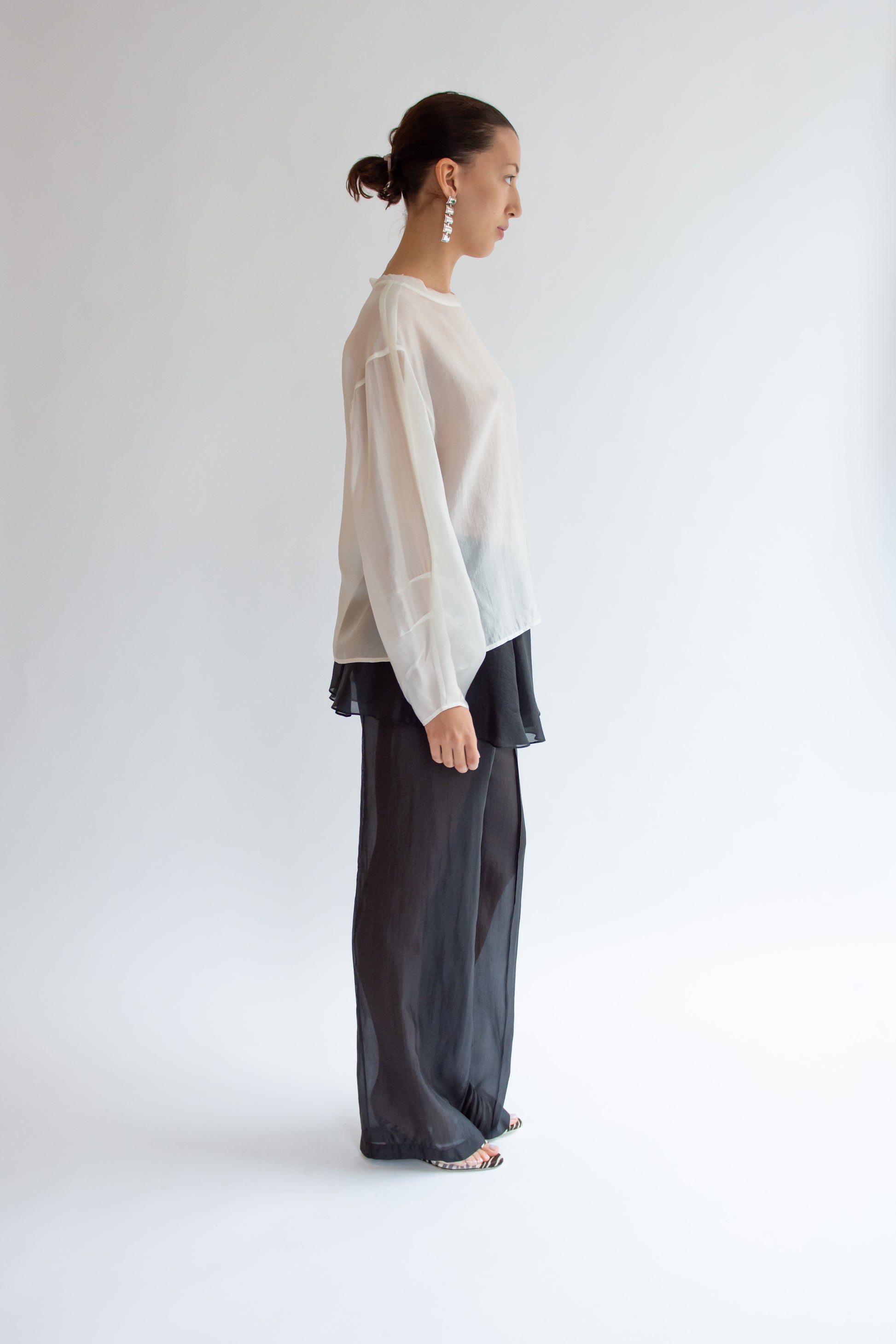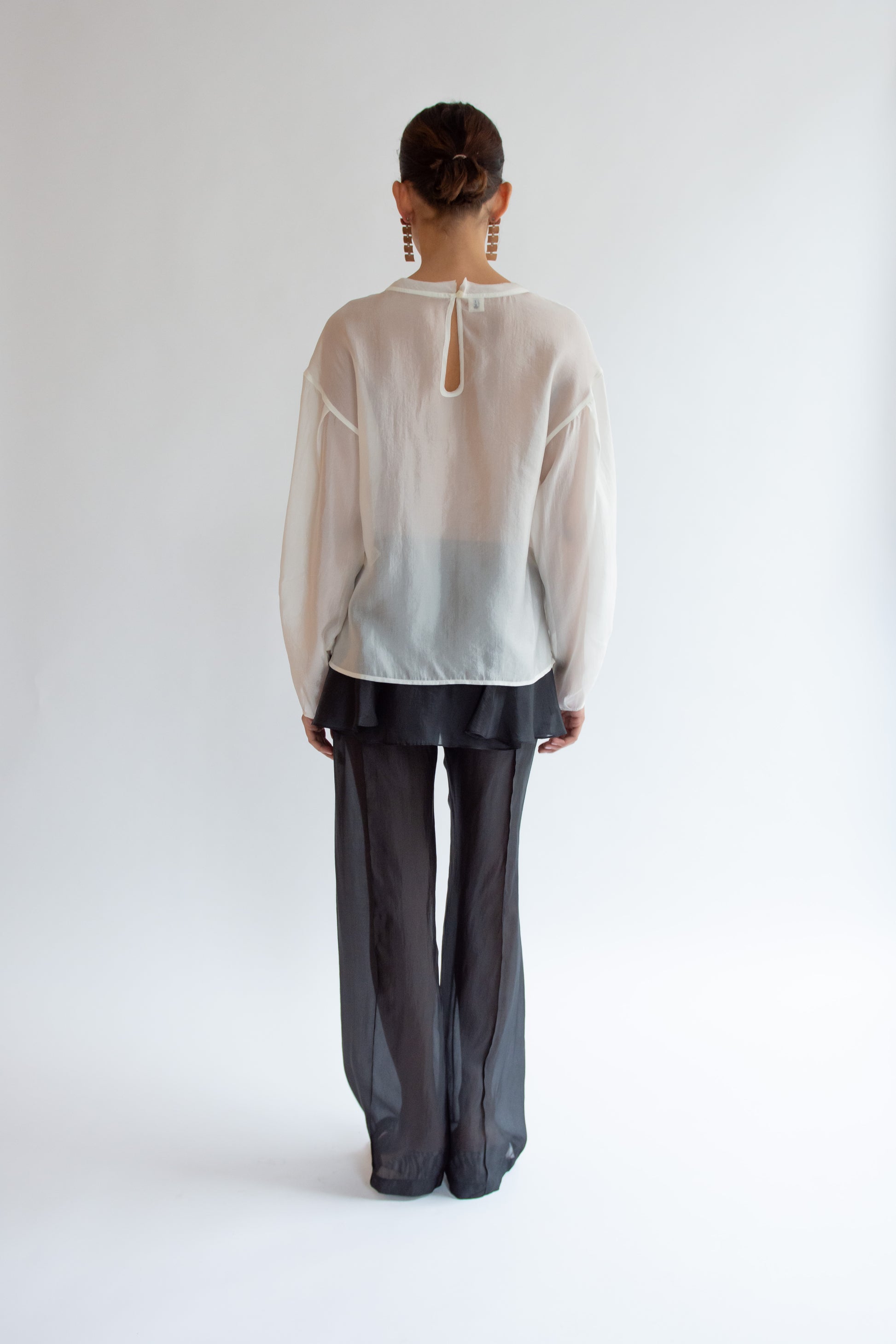Long-sleeved blouse in sheer soft ivory organza. Round neckline with binding detail. Relaxed fluid silhouette. Back keyhole closure with button. Unlined. Match with Gilian Volume Skirt.