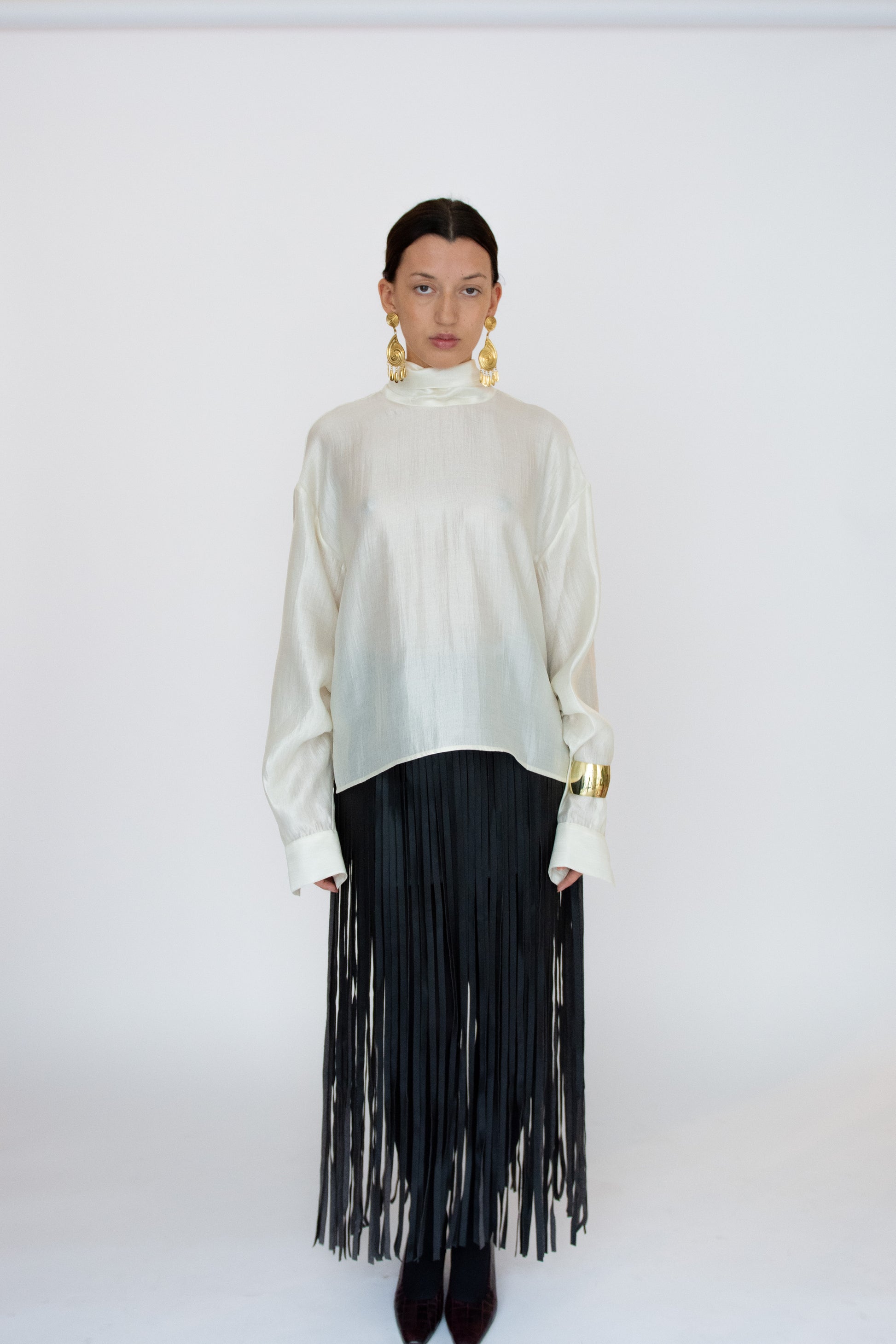 Boxy top with high tie nick and gathered sash in an ivory, viscose blend lightweight faille. Dropped shoulders with long, dramatic sleeves and wide cuffs. Shiny silver decorative buttons at wide sleeve cuffs. Open slit at back. Shirt can also be styled reversed for a plunging neckline.