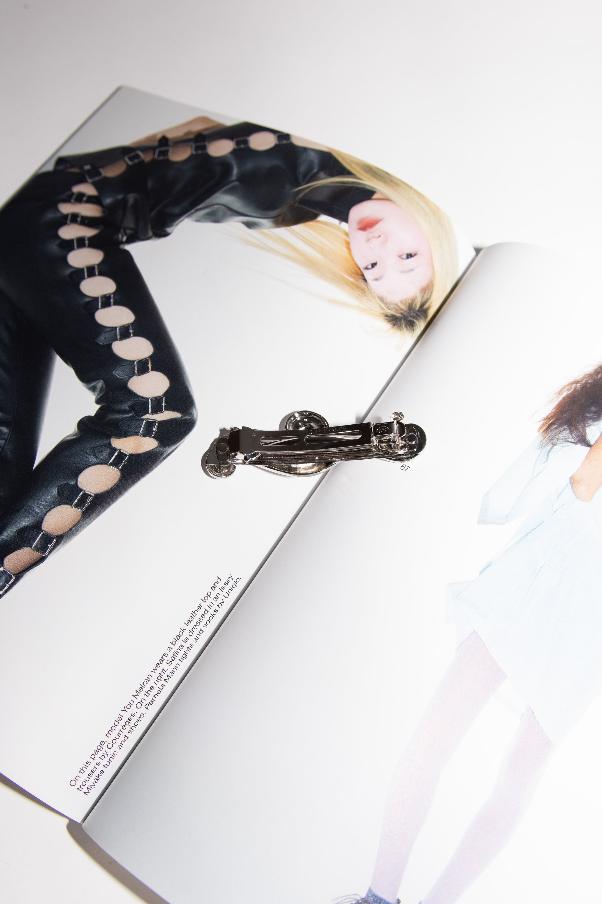 Hair clip in brass with platinum finish. Crocodile closure for secure hold.