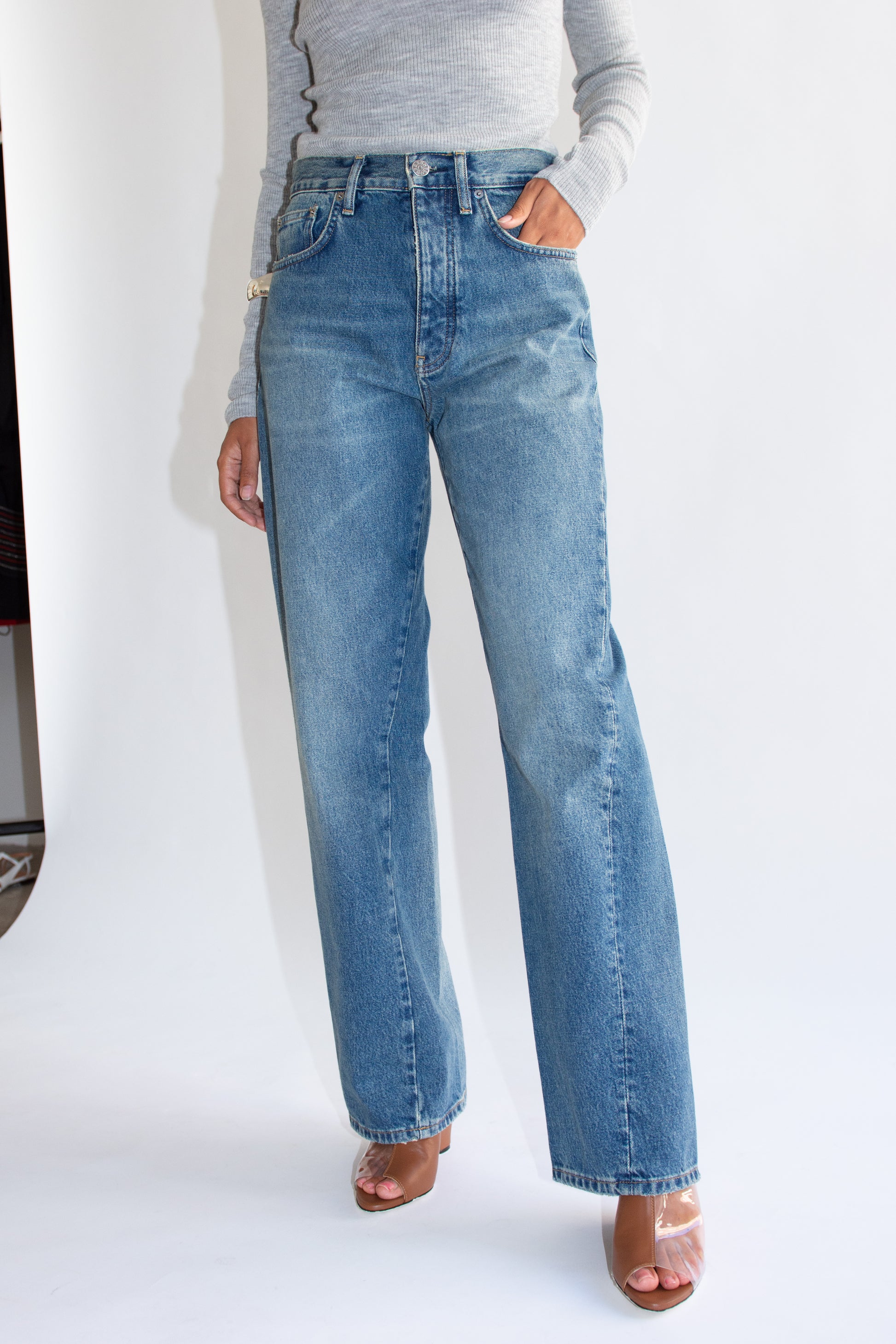Mid-rise, Wide leg, 5-pocket jean in a 14 oz organic cotton indigo blue denim. Washed for a dark blue vintage feel. Twisted seam detail at leg to create slight barrel leg. Belt loops. Silver metal hardware.